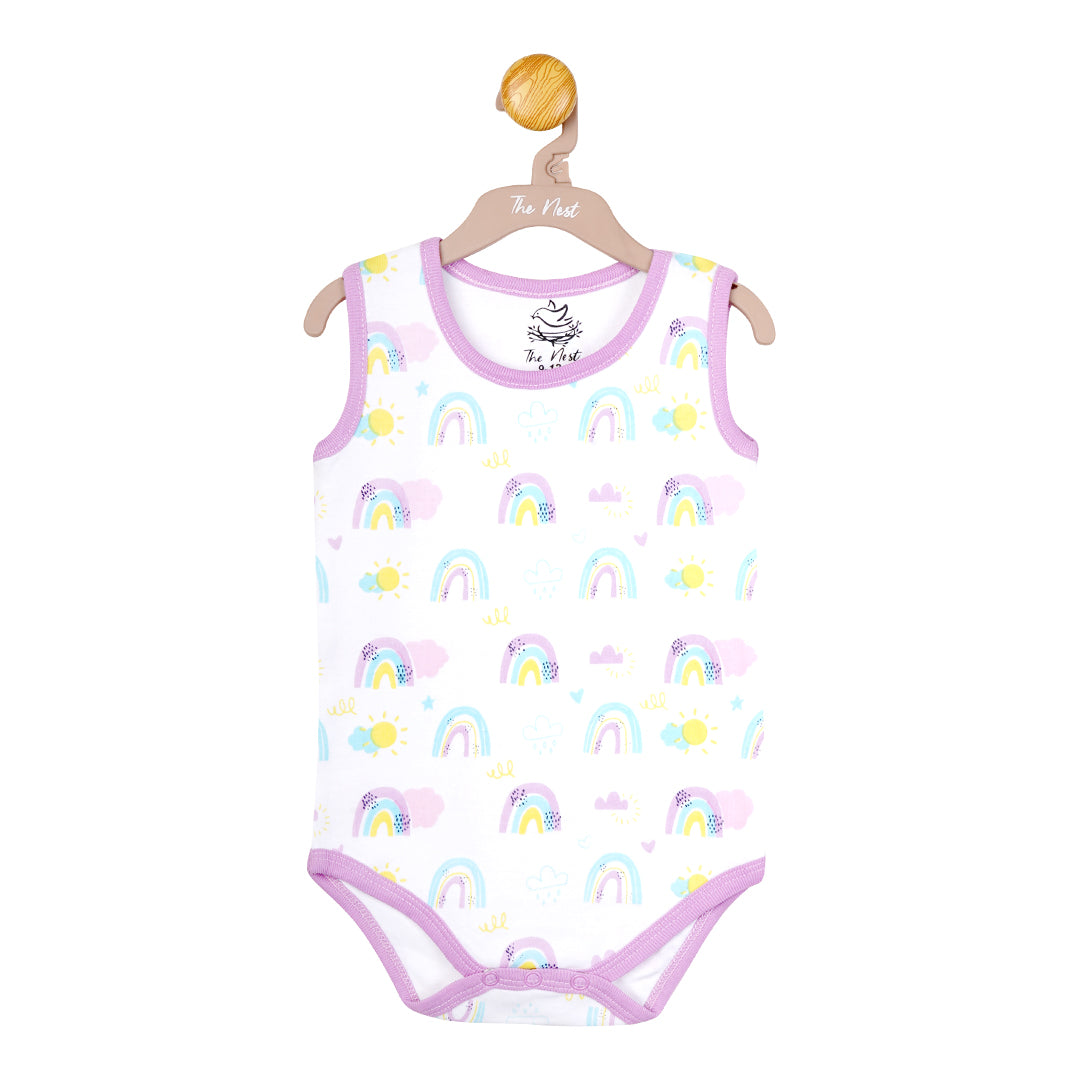 Add a touch of cuteness to your baby girl's wardrobe with our "Rainbow Bliss" bodysuit! Made with 100% buttery soft cotton, this durable and comfortable bodysuit features a delightful pastel pink, light yellow, and cyan cloud and rainbow print set against a white base with a rosy pink trim. The convenient snap buttons make diaper changes a breeze, while the lightweight material is perfect for warm summer days. The playful pastel colors and fun print make this bodysuit a standout piece in any outfit, making your little girl the star of the show! This versatile body suit works as both a standalone outfit or coordinating piece with any other The Nest product