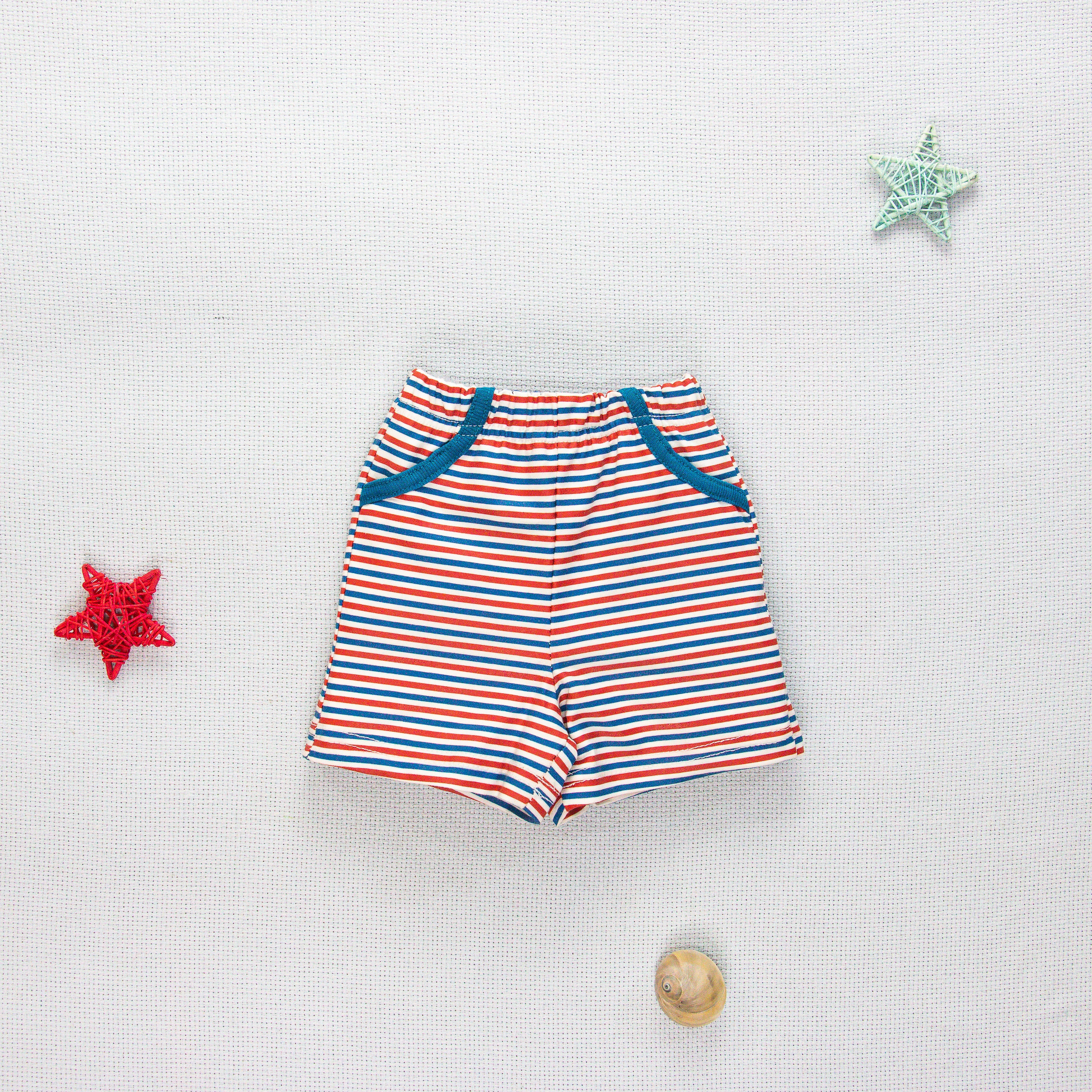 The crisp Stripe White base is elevated with high-contrast red and navy blue horizontal stripes, making these shorts the perfect pairing for a basic tee or a matching nautical bodysuit.